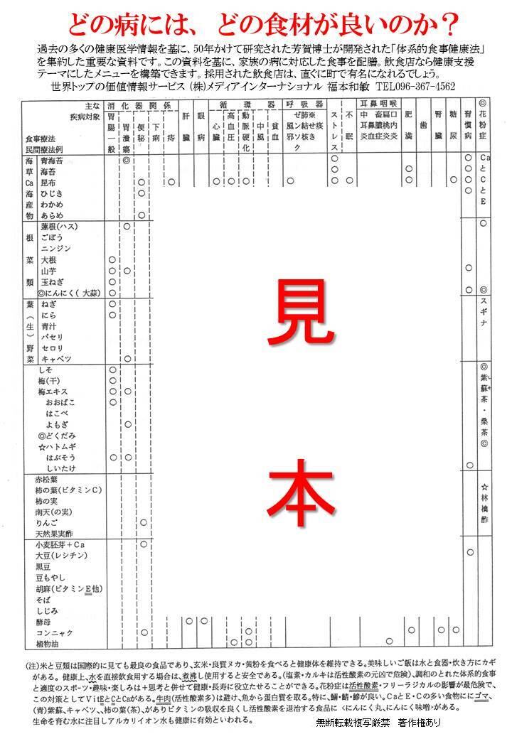 過去の多くの健康医学情報を基に、50年かけて研究された、芳賀博士が開発された「体系的食事健康法」を集約した重要資料です。この資料を基に、家族の病に対応した食事を配膳。飲食店なら健康支援テーマにしたメニューを構築できます。採用された飲食店は直ぐに町で有名になれるでしょう。